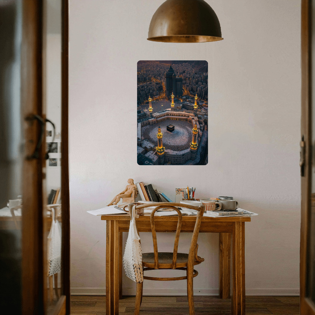 Heart of Islam embodies the core of Muslim unity – an intricate fusion of the Kaaba silhouette, blooming geometric patterns, and radiant calligraphy inspired by the Shahada. Sublimated onto premium metal, the design flows in deep emerald greens, golds, and serene blues, symbolizing peace, Ummah, and divine connection. A timeless tribute to Islam’s spiritual heart.